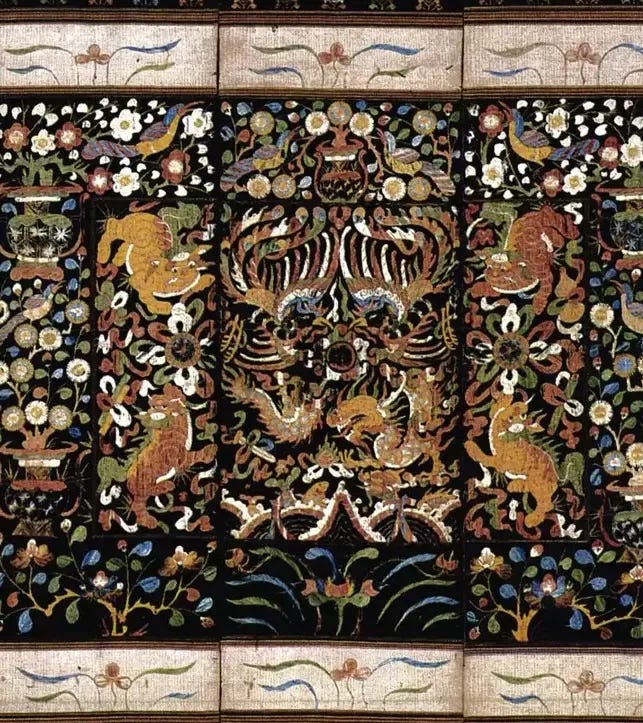 The Li people of Hainan - the “sea dragons incarnate” - were expert weavers, with embroidered dragons appearing on their bedding. They inked dragon tatoos on their legs, arms, and bodies. Their long bei 龙被, dragon quilts, were used for ceremonial purposes.